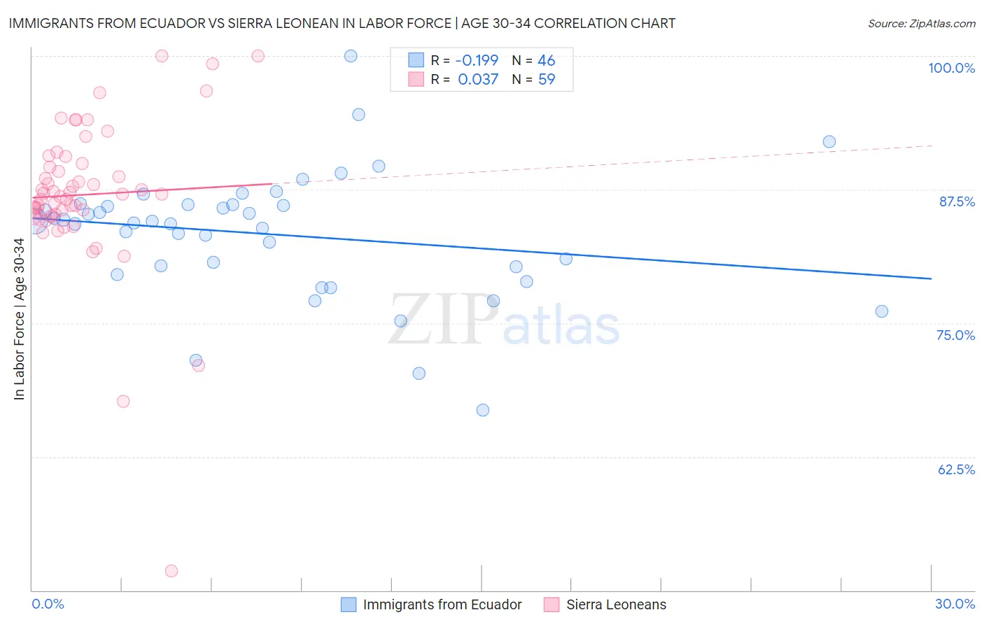Immigrants from Ecuador vs Sierra Leonean In Labor Force | Age 30-34 Correlation Chart