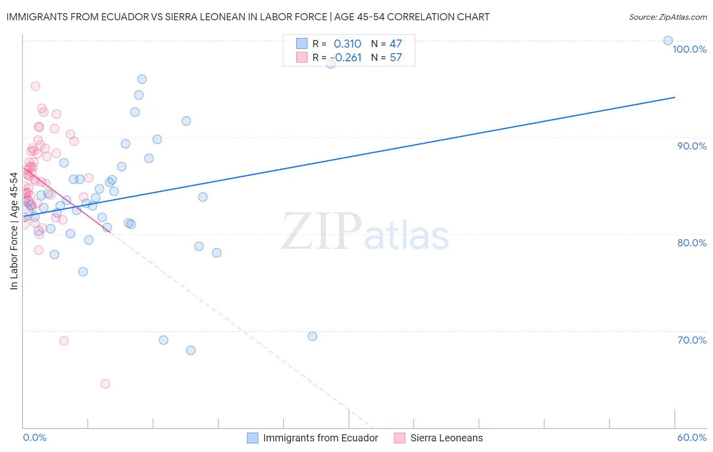 Immigrants from Ecuador vs Sierra Leonean In Labor Force | Age 45-54 Correlation Chart