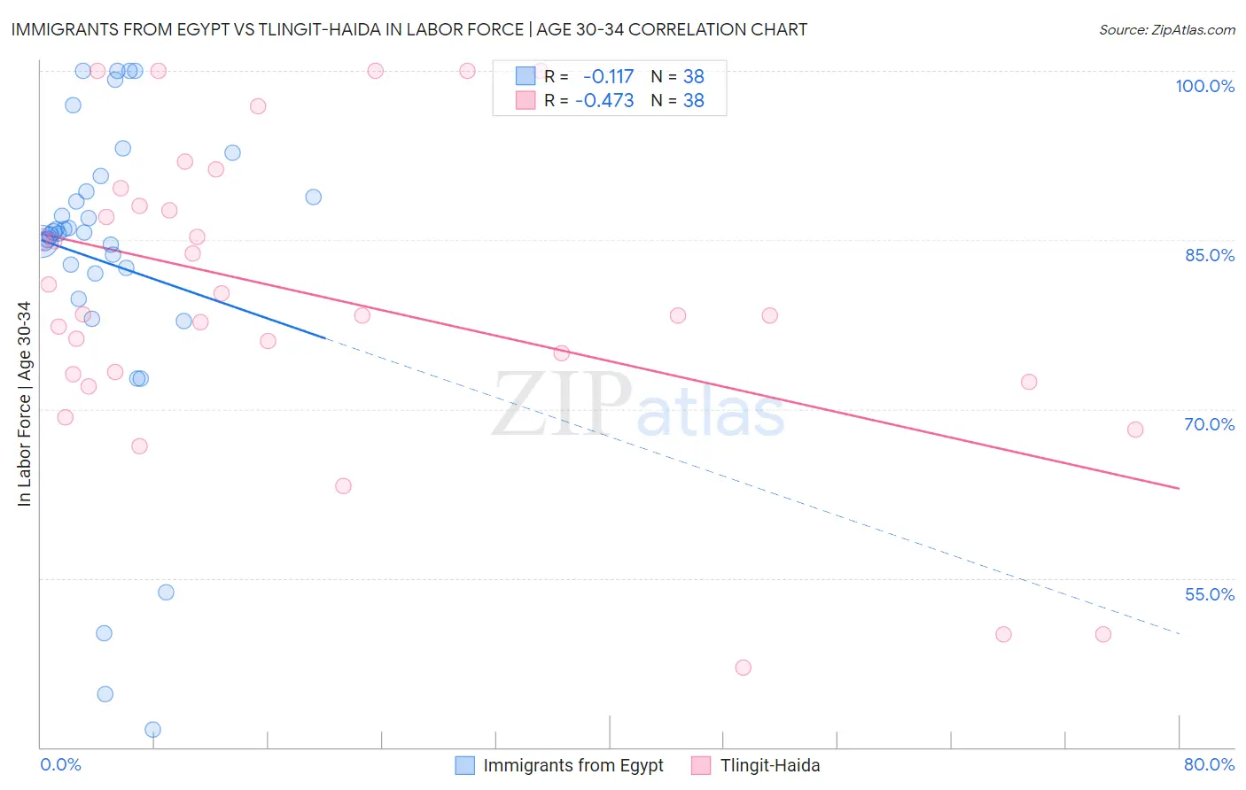 Immigrants from Egypt vs Tlingit-Haida In Labor Force | Age 30-34 Correlation Chart