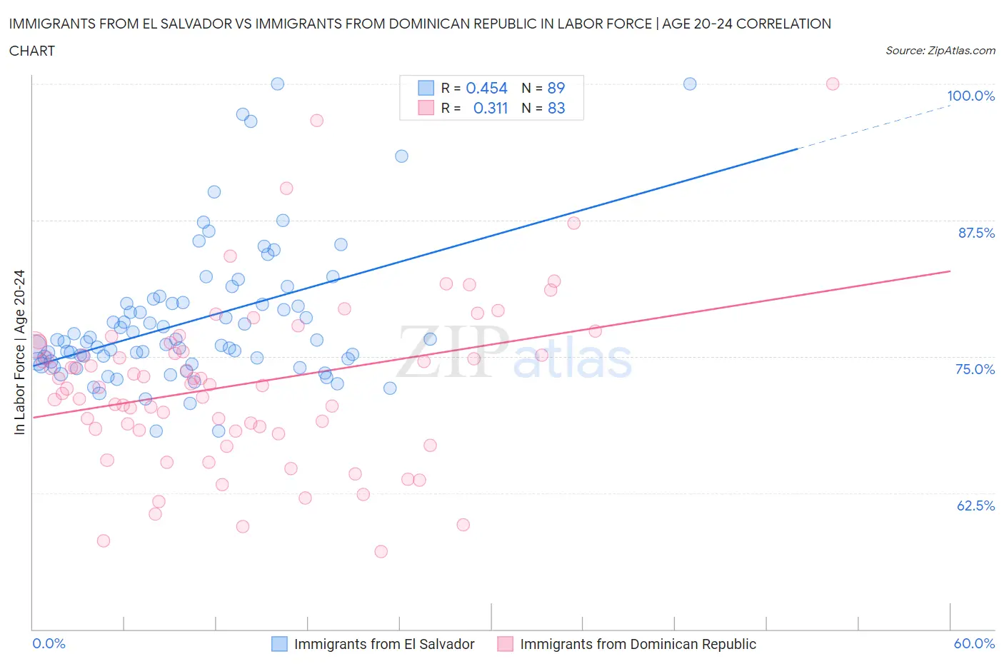 Immigrants from El Salvador vs Immigrants from Dominican Republic In Labor Force | Age 20-24 Correlation Chart