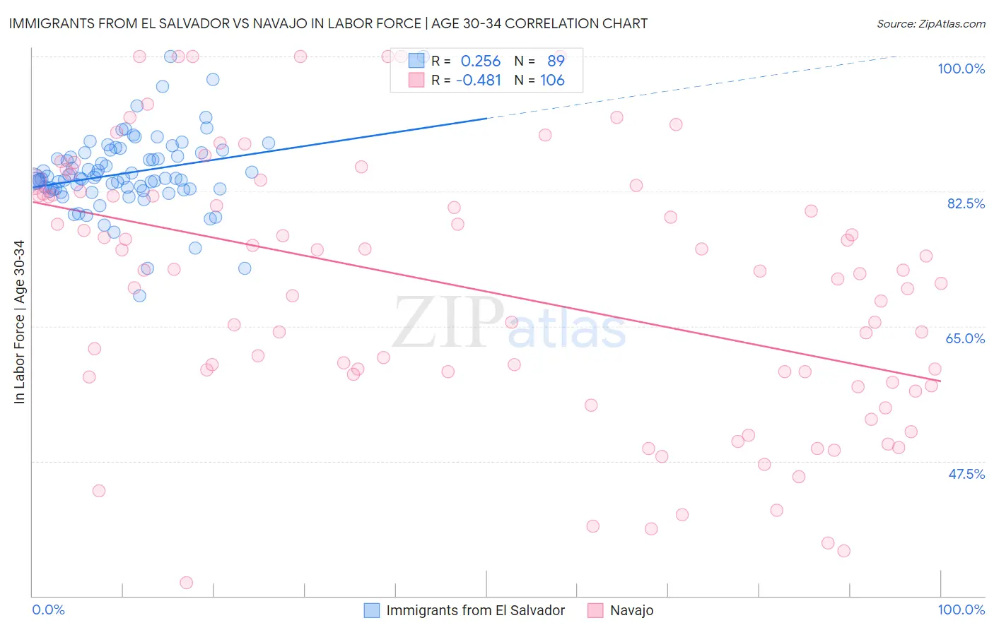 Immigrants from El Salvador vs Navajo In Labor Force | Age 30-34 Correlation Chart