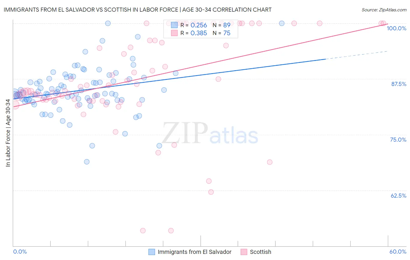 Immigrants from El Salvador vs Scottish In Labor Force | Age 30-34 Correlation Chart