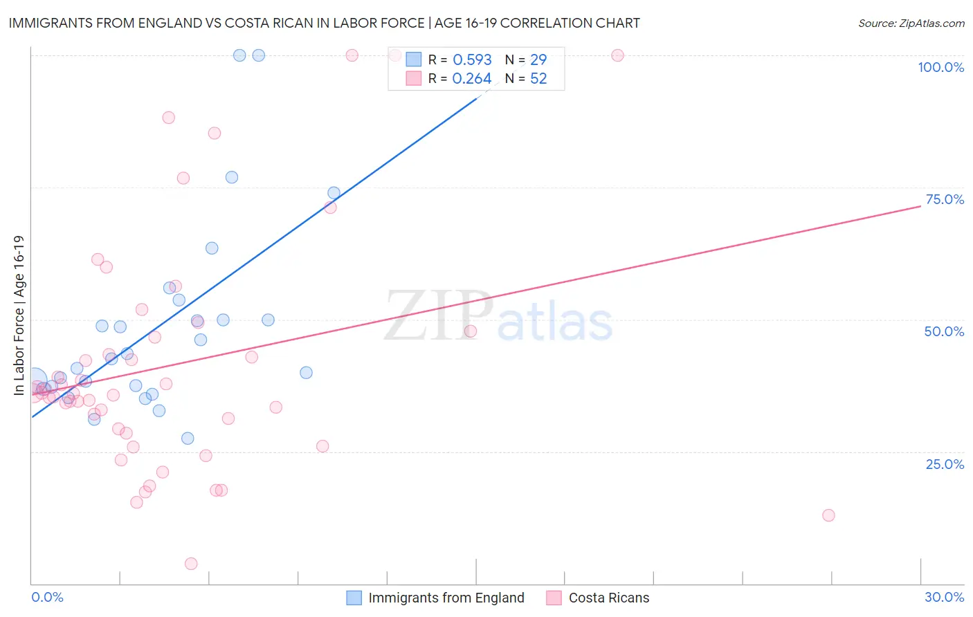 Immigrants from England vs Costa Rican In Labor Force | Age 16-19 Correlation Chart