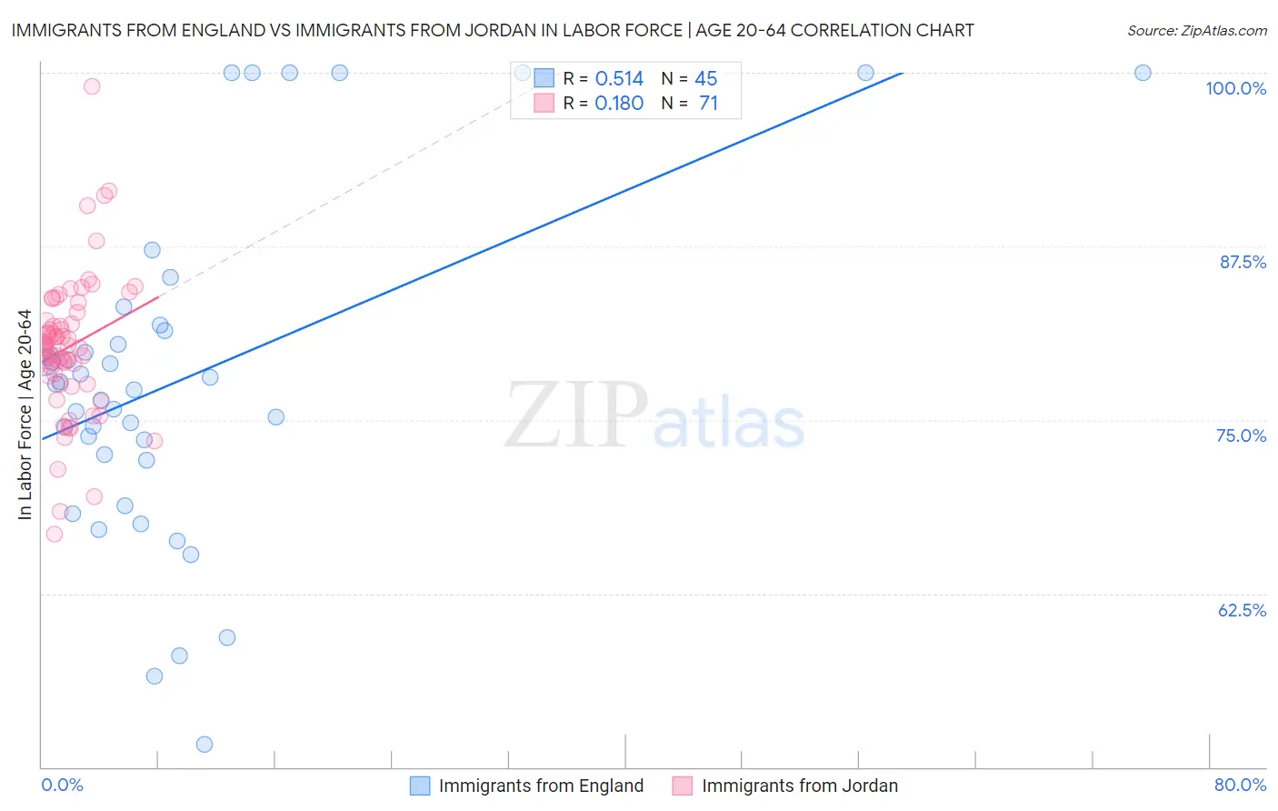 Immigrants from England vs Immigrants from Jordan In Labor Force | Age 20-64 Correlation Chart