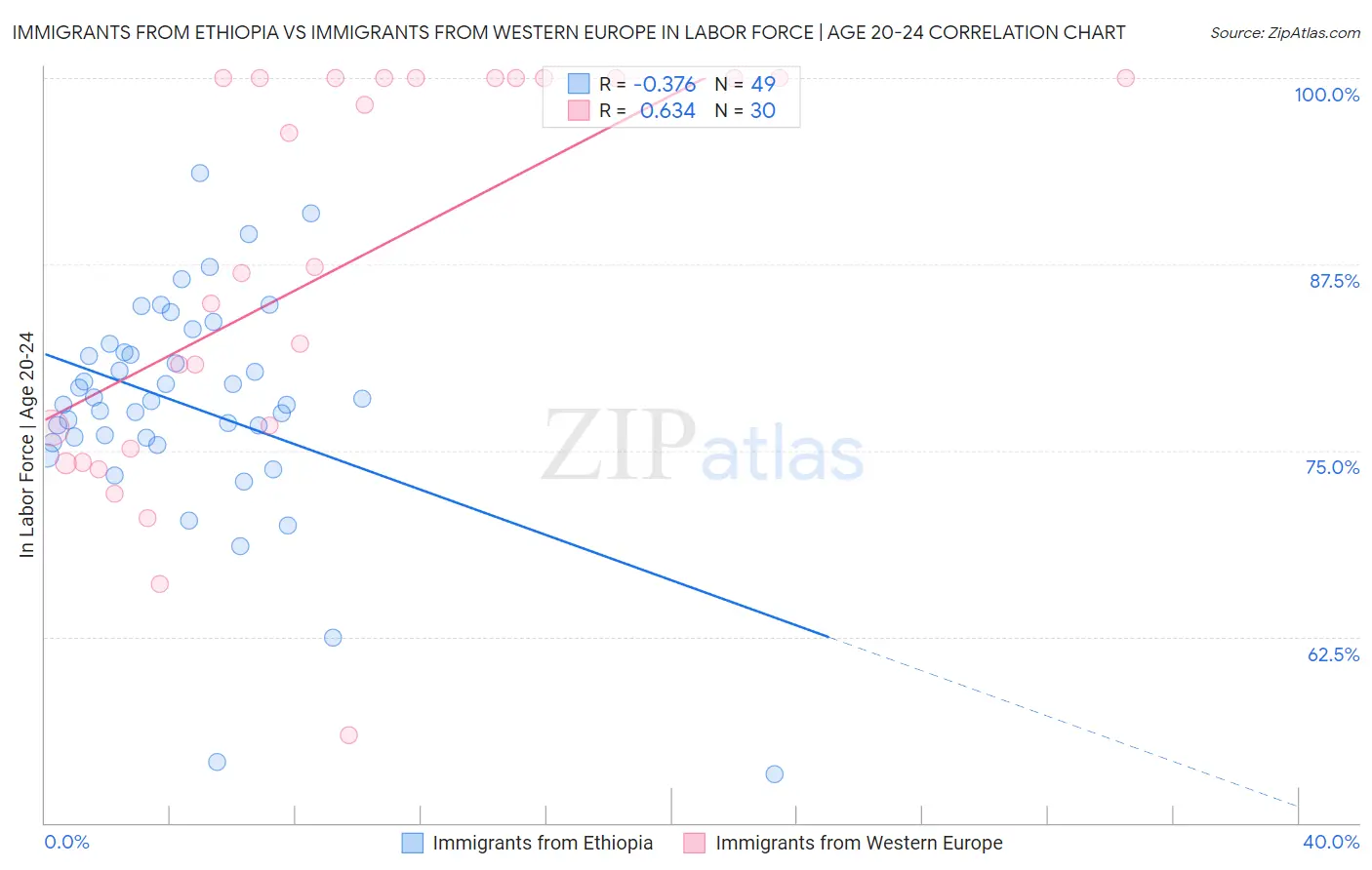 Immigrants from Ethiopia vs Immigrants from Western Europe In Labor Force | Age 20-24 Correlation Chart