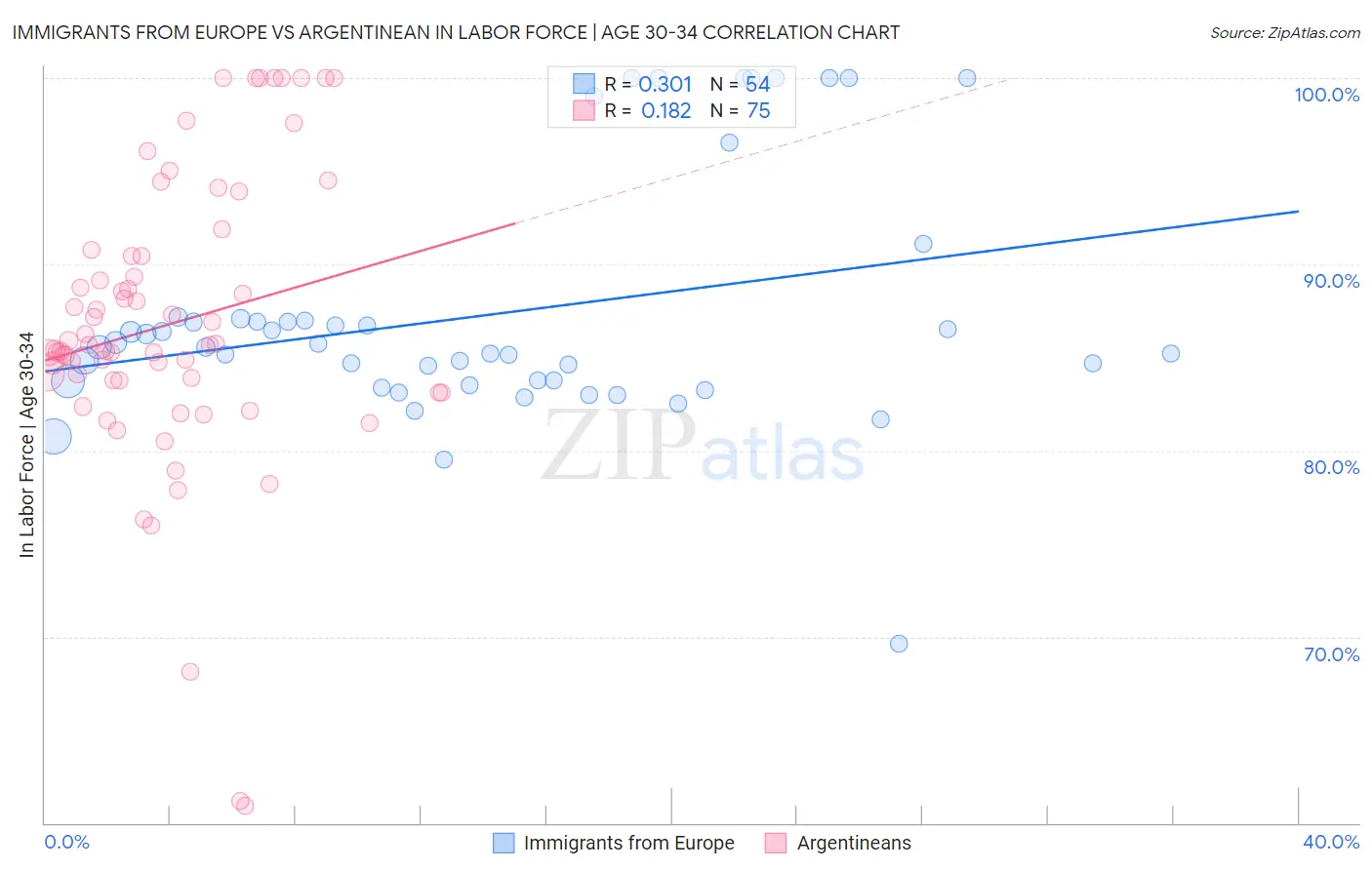 Immigrants from Europe vs Argentinean In Labor Force | Age 30-34 Correlation Chart