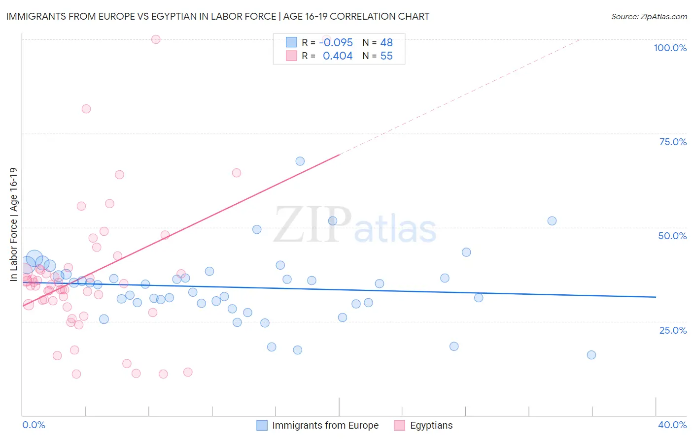 Immigrants from Europe vs Egyptian In Labor Force | Age 16-19 Correlation Chart