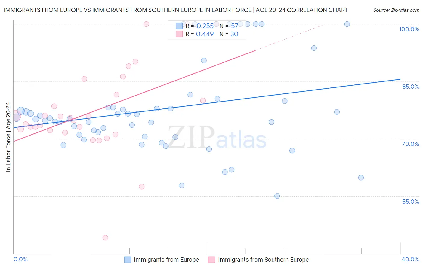 Immigrants from Europe vs Immigrants from Southern Europe In Labor Force | Age 20-24 Correlation Chart