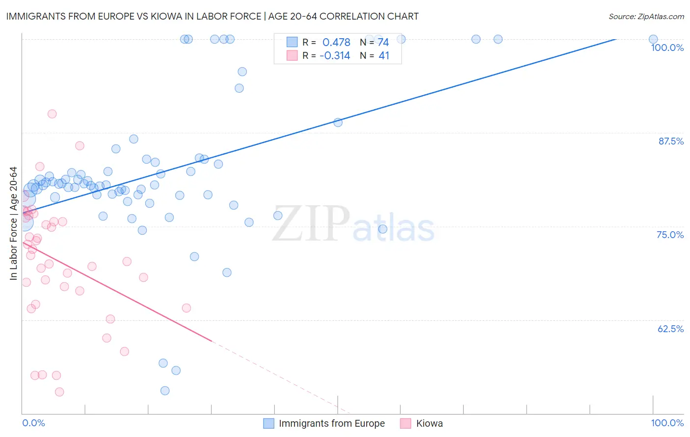 Immigrants from Europe vs Kiowa In Labor Force | Age 20-64