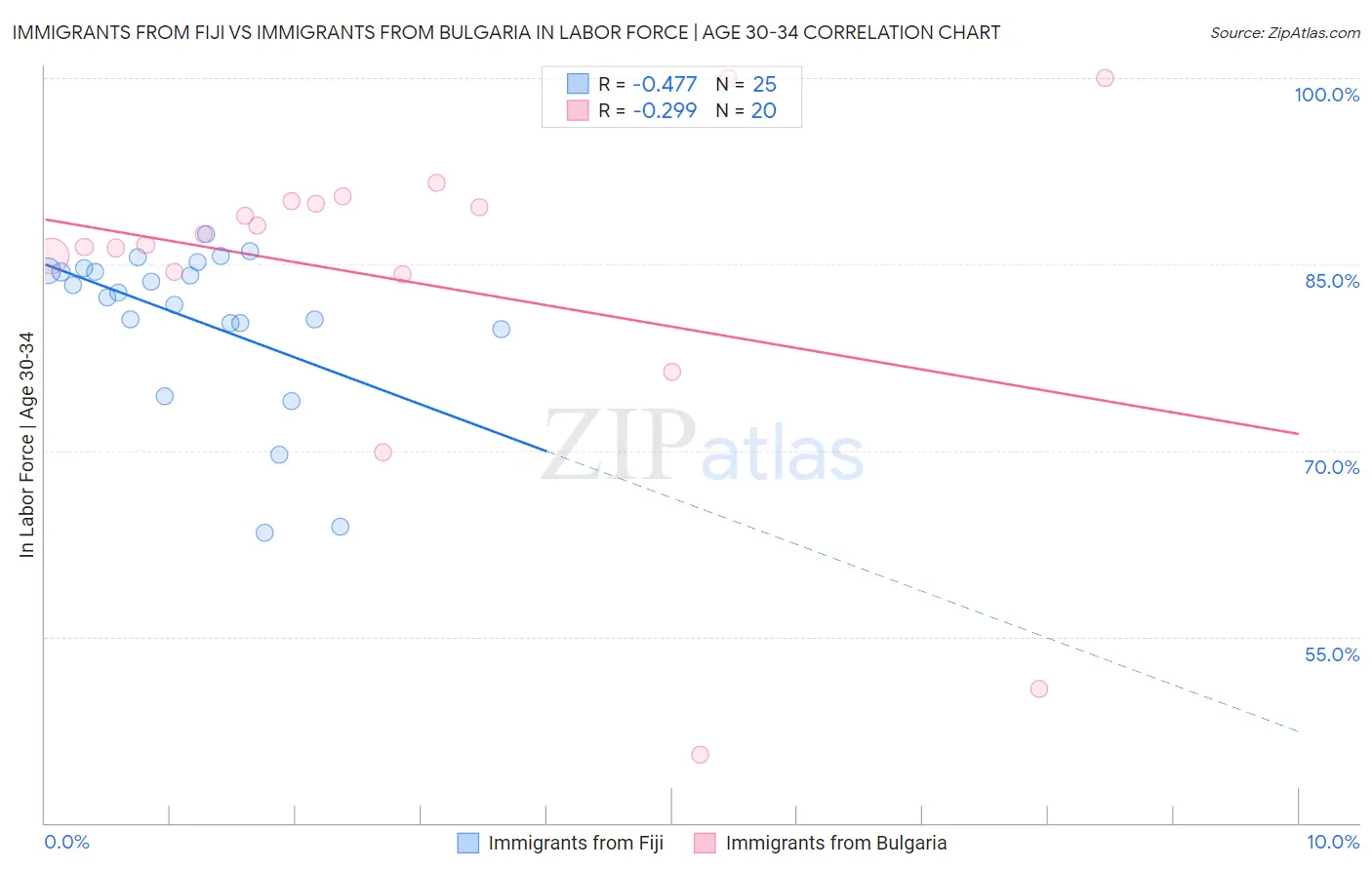 Immigrants from Fiji vs Immigrants from Bulgaria In Labor Force | Age 30-34 Correlation Chart