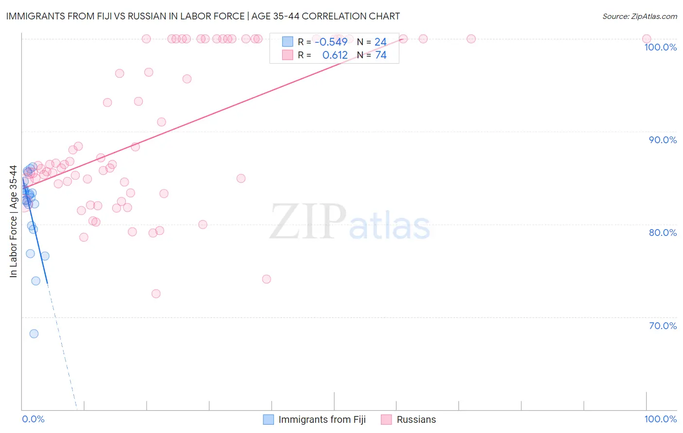 Immigrants from Fiji vs Russian In Labor Force | Age 35-44 Correlation Chart