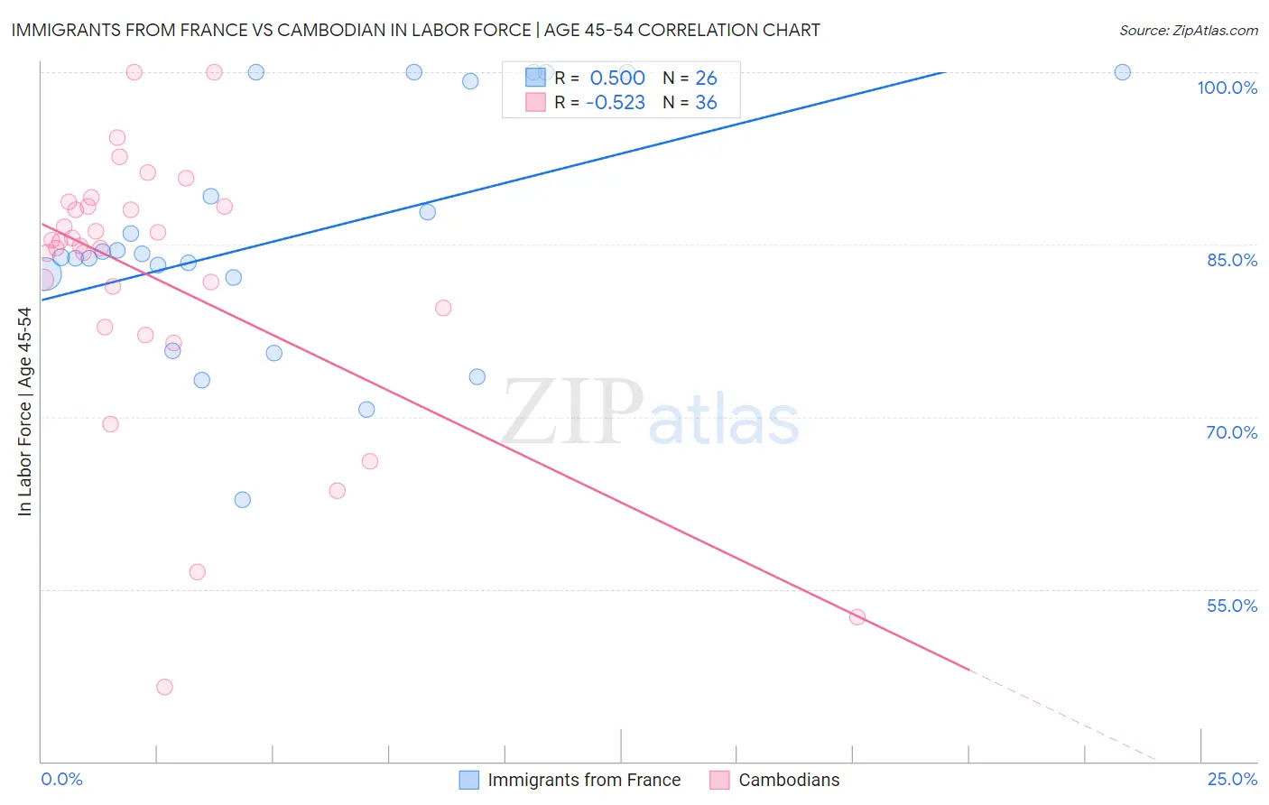 Immigrants from France vs Cambodian In Labor Force | Age 45-54 Correlation Chart