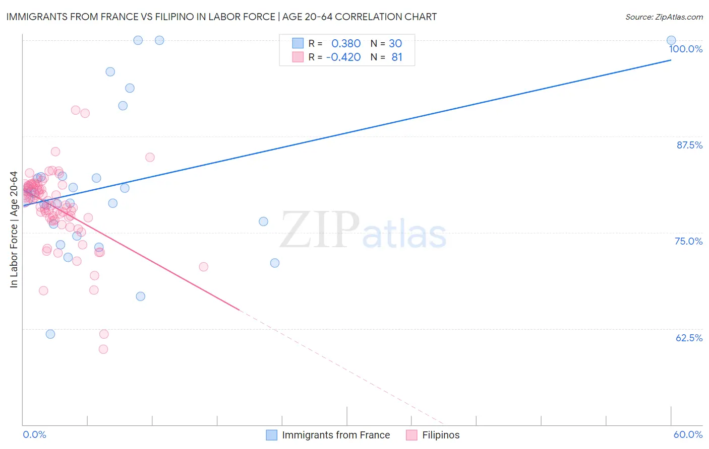Immigrants from France vs Filipino In Labor Force | Age 20-64 Correlation Chart
