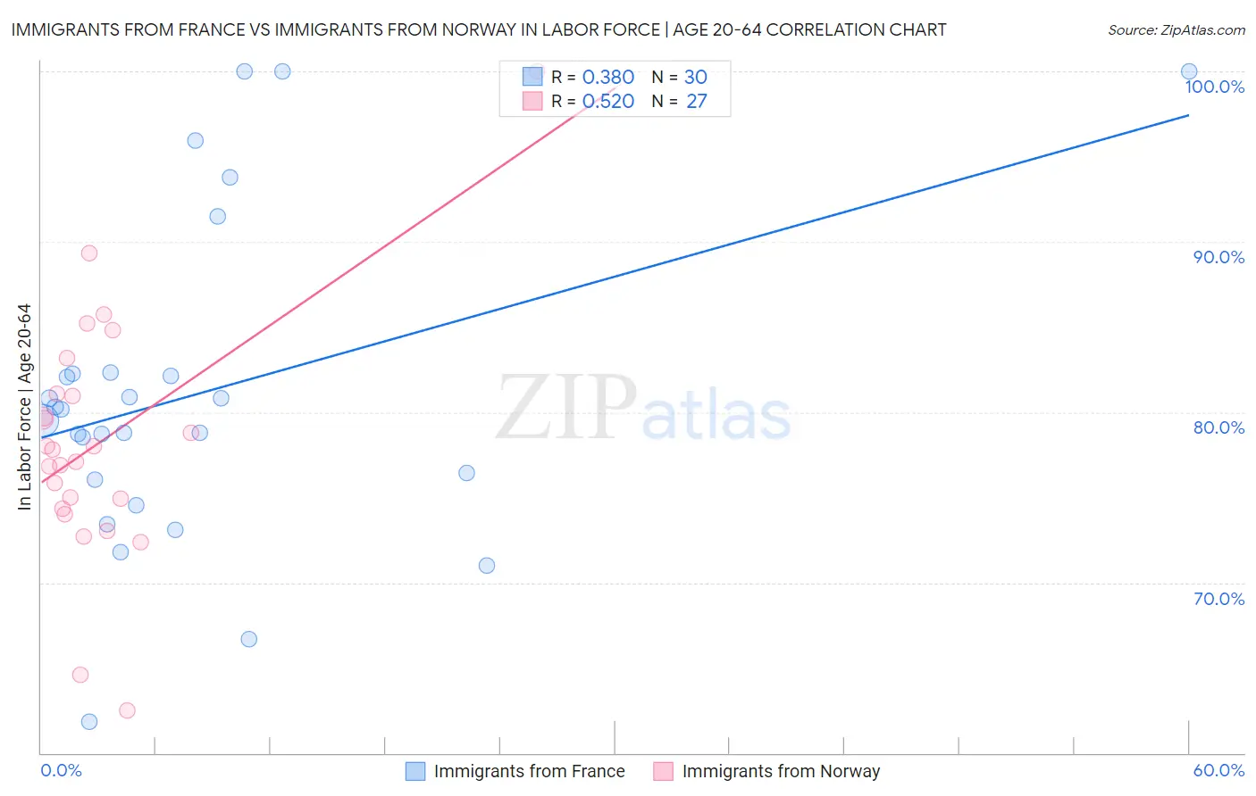 Immigrants from France vs Immigrants from Norway In Labor Force | Age 20-64 Correlation Chart