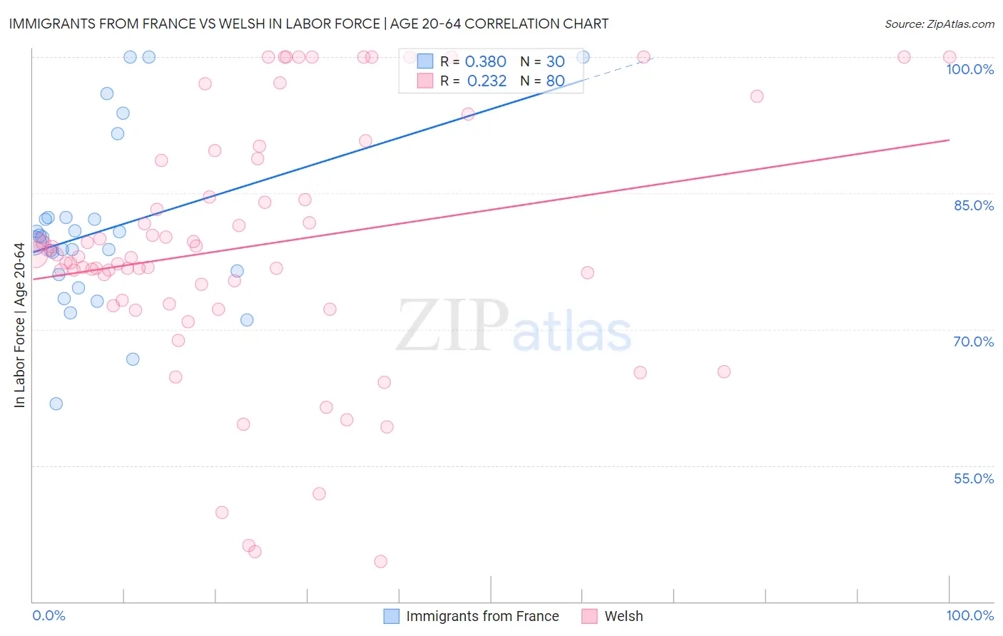 Immigrants from France vs Welsh In Labor Force | Age 20-64 Correlation Chart