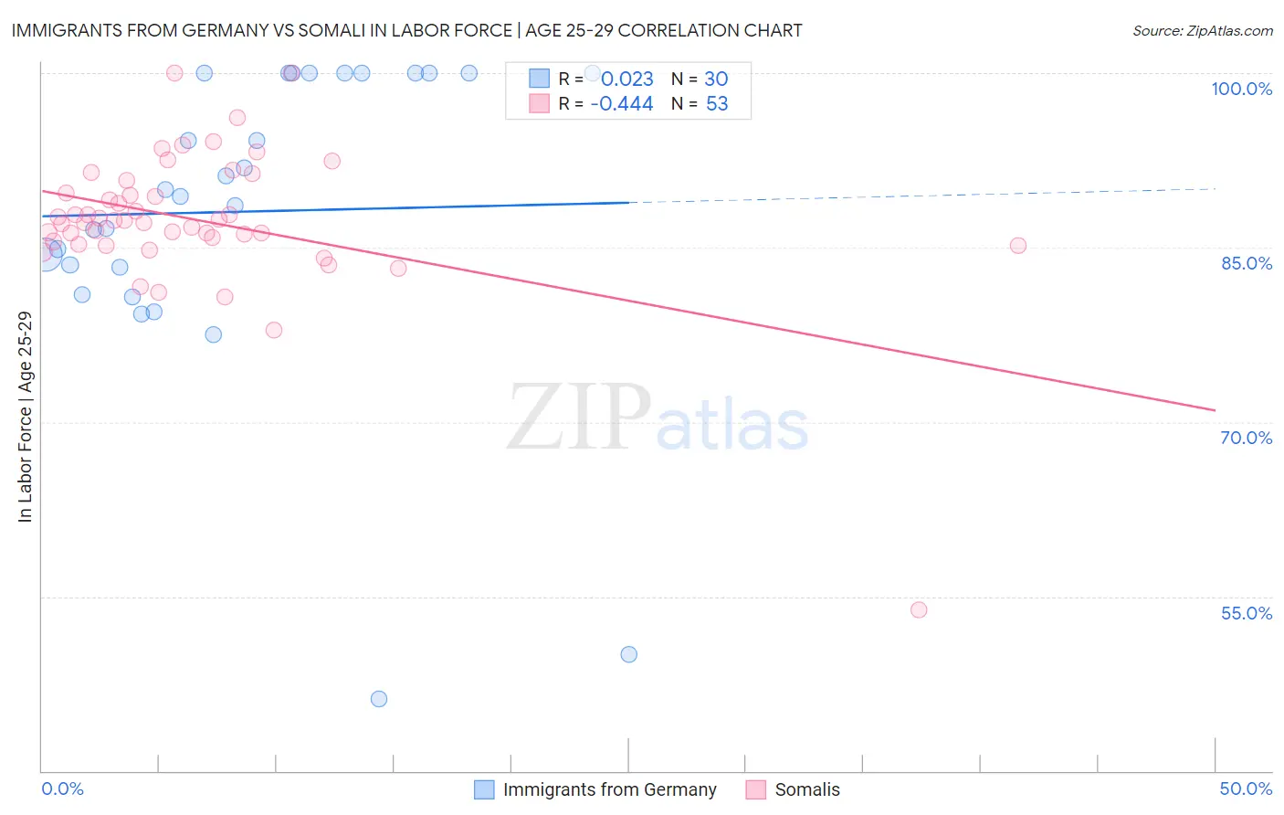 Immigrants from Germany vs Somali In Labor Force | Age 25-29 Correlation Chart