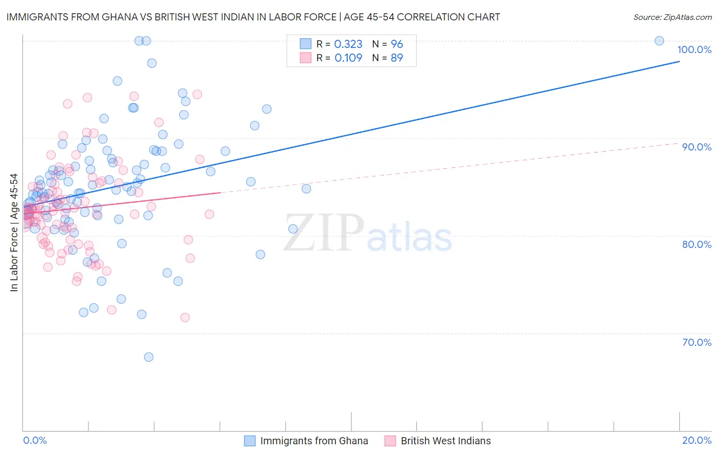 Immigrants from Ghana vs British West Indian In Labor Force | Age 45-54 Correlation Chart