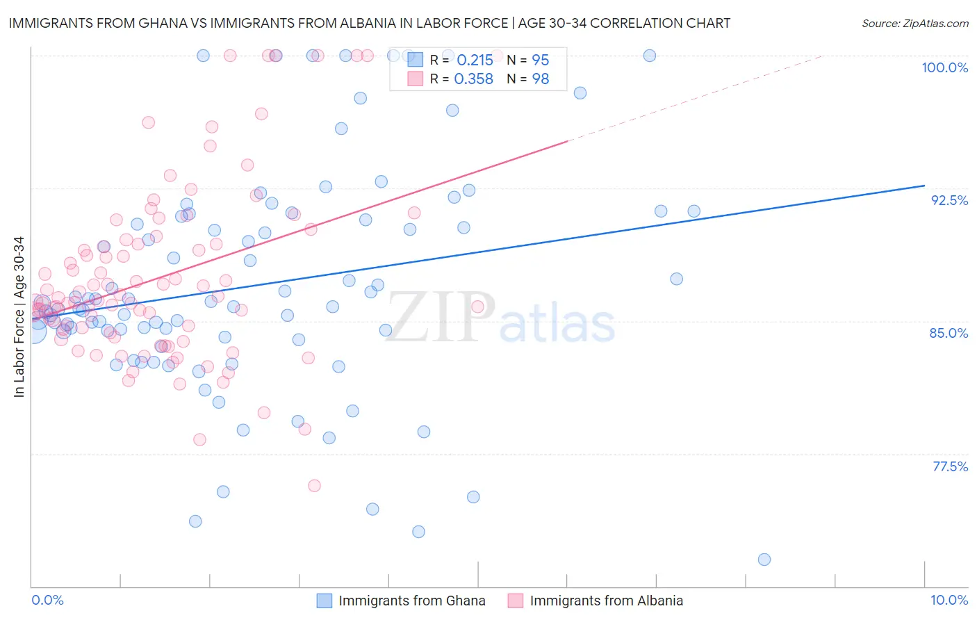 Immigrants from Ghana vs Immigrants from Albania In Labor Force | Age 30-34 Correlation Chart
