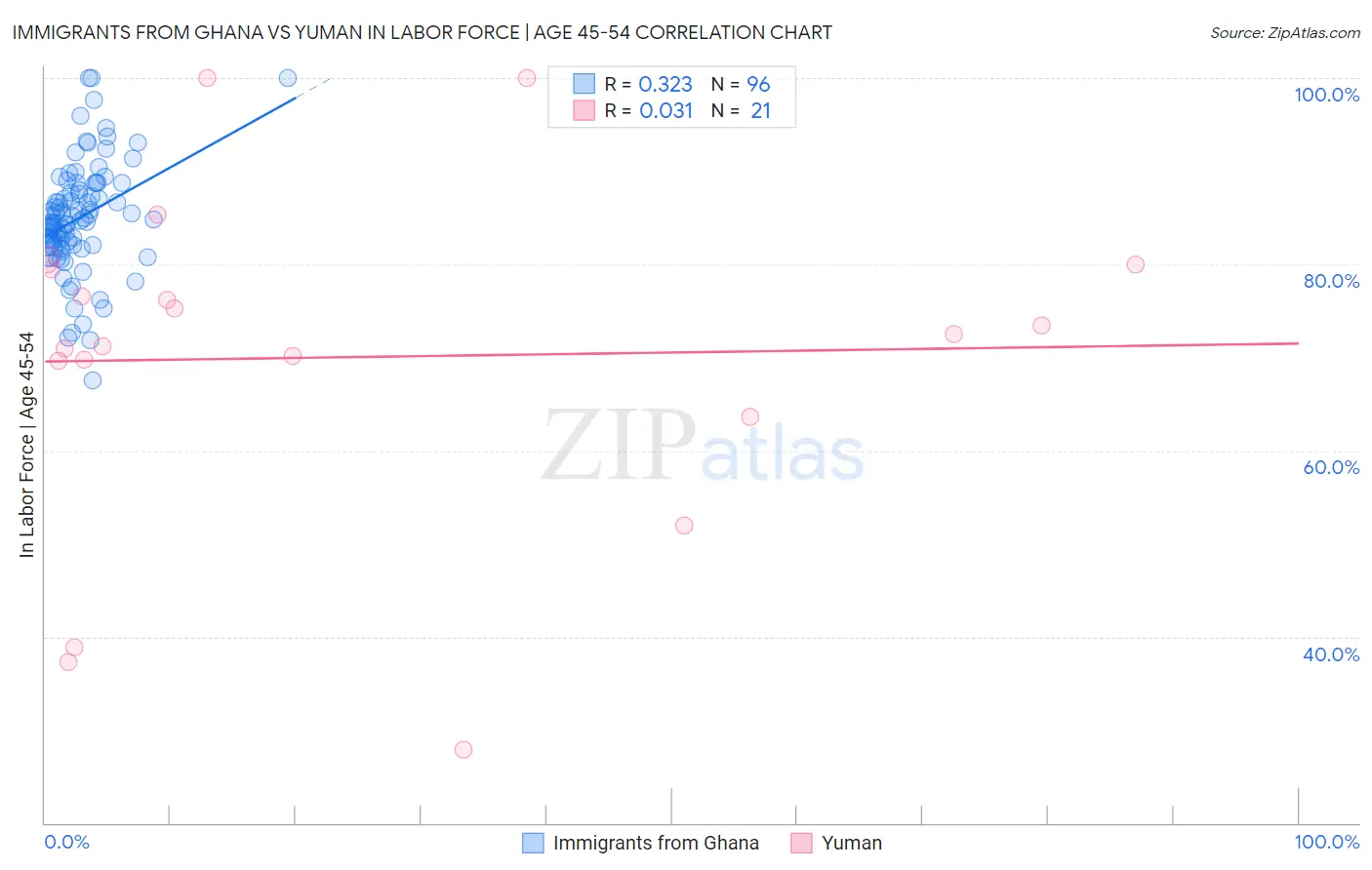 Immigrants from Ghana vs Yuman In Labor Force | Age 45-54 Correlation Chart