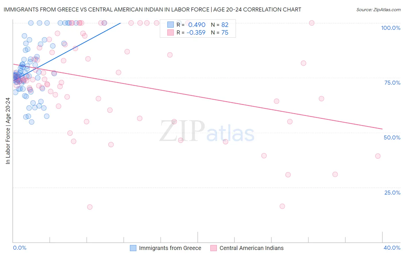 Immigrants from Greece vs Central American Indian In Labor Force | Age 20-24 Correlation Chart
