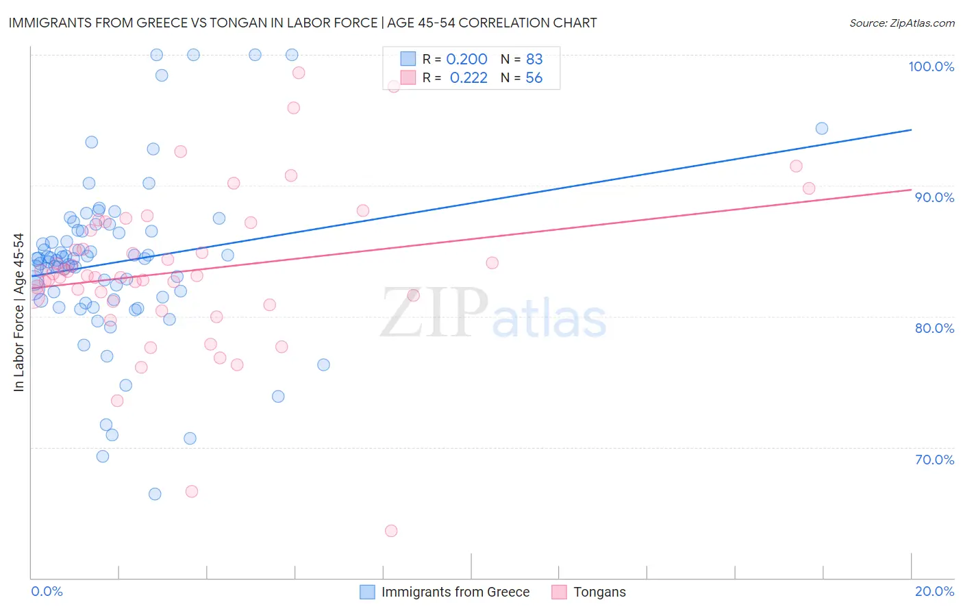 Immigrants from Greece vs Tongan In Labor Force | Age 45-54 Correlation Chart