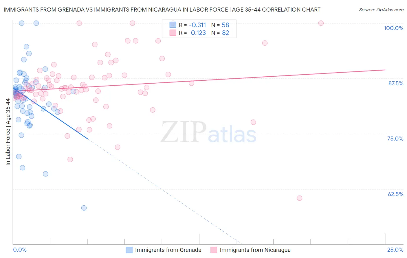 Immigrants from Grenada vs Immigrants from Nicaragua In Labor Force | Age 35-44 Correlation Chart