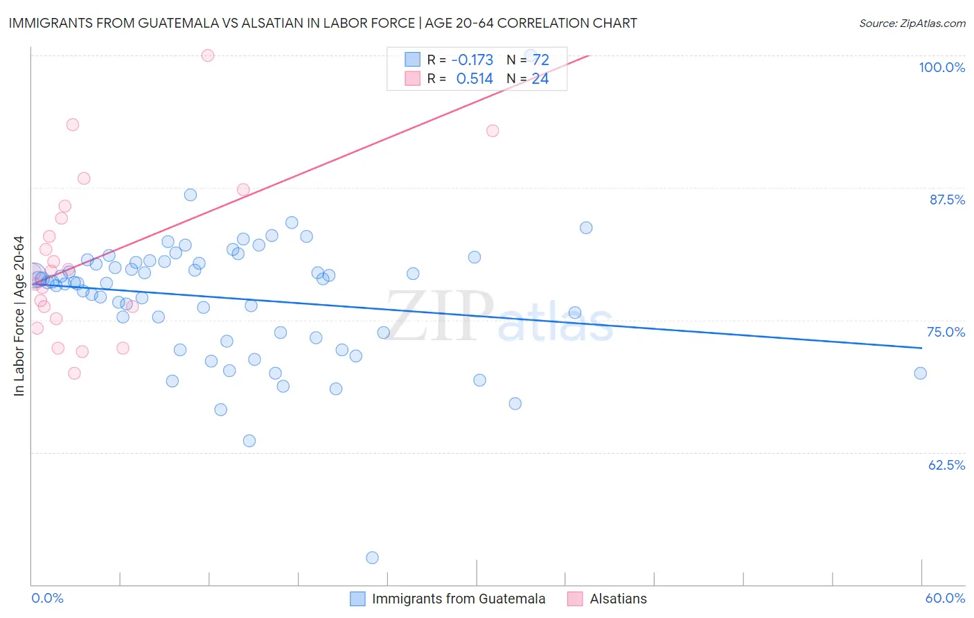Immigrants from Guatemala vs Alsatian In Labor Force | Age 20-64 Correlation Chart