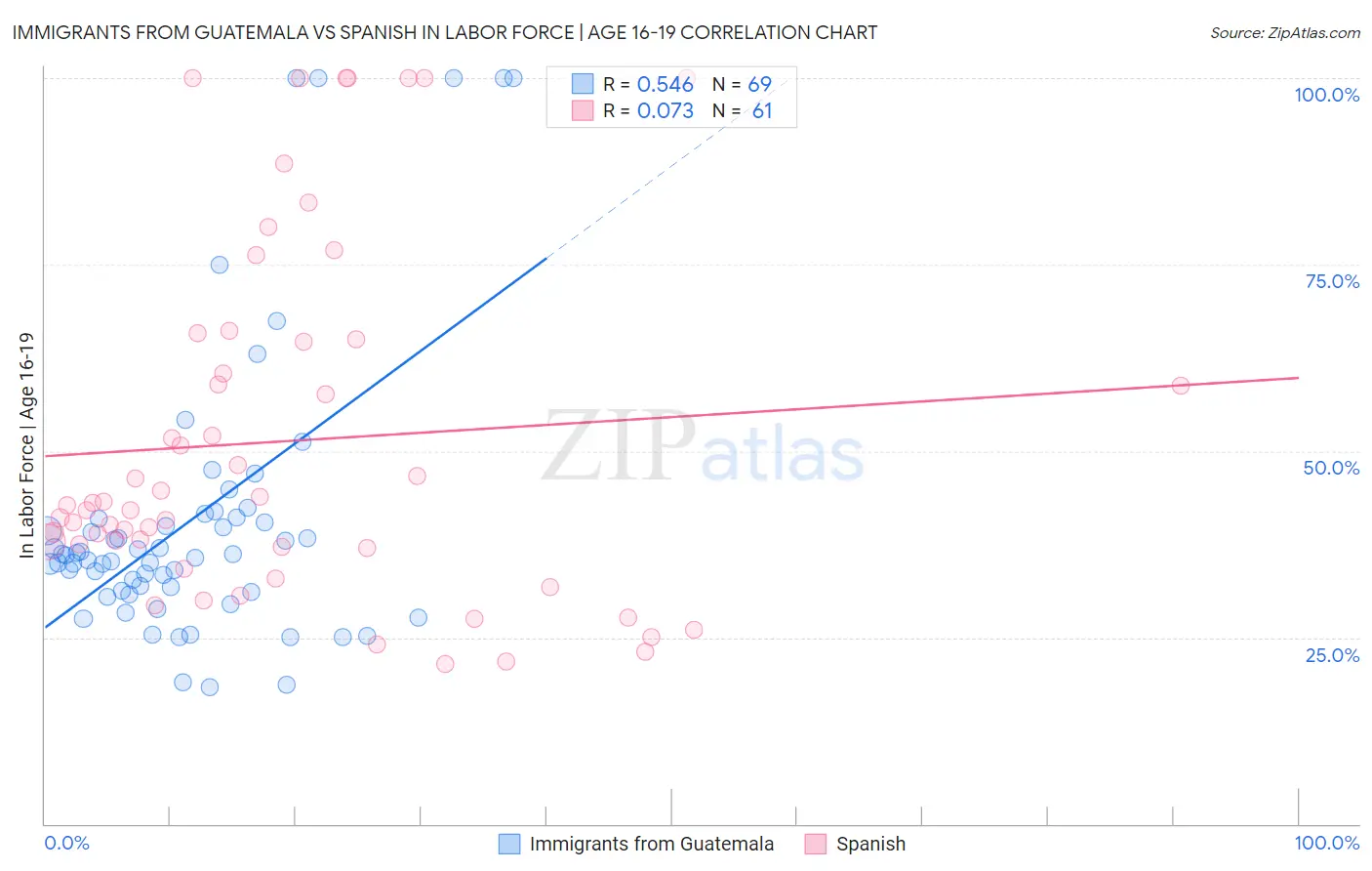 Immigrants from Guatemala vs Spanish In Labor Force | Age 16-19 Correlation Chart