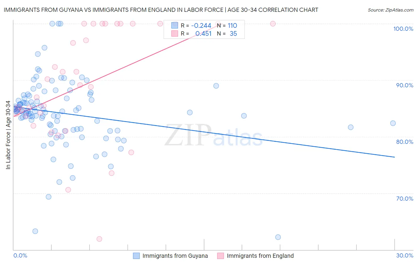 Immigrants from Guyana vs Immigrants from England In Labor Force | Age 30-34 Correlation Chart