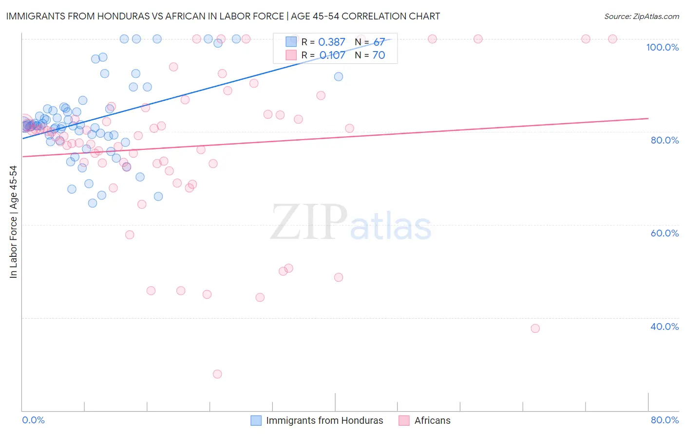 Immigrants from Honduras vs African In Labor Force | Age 45-54 Correlation Chart