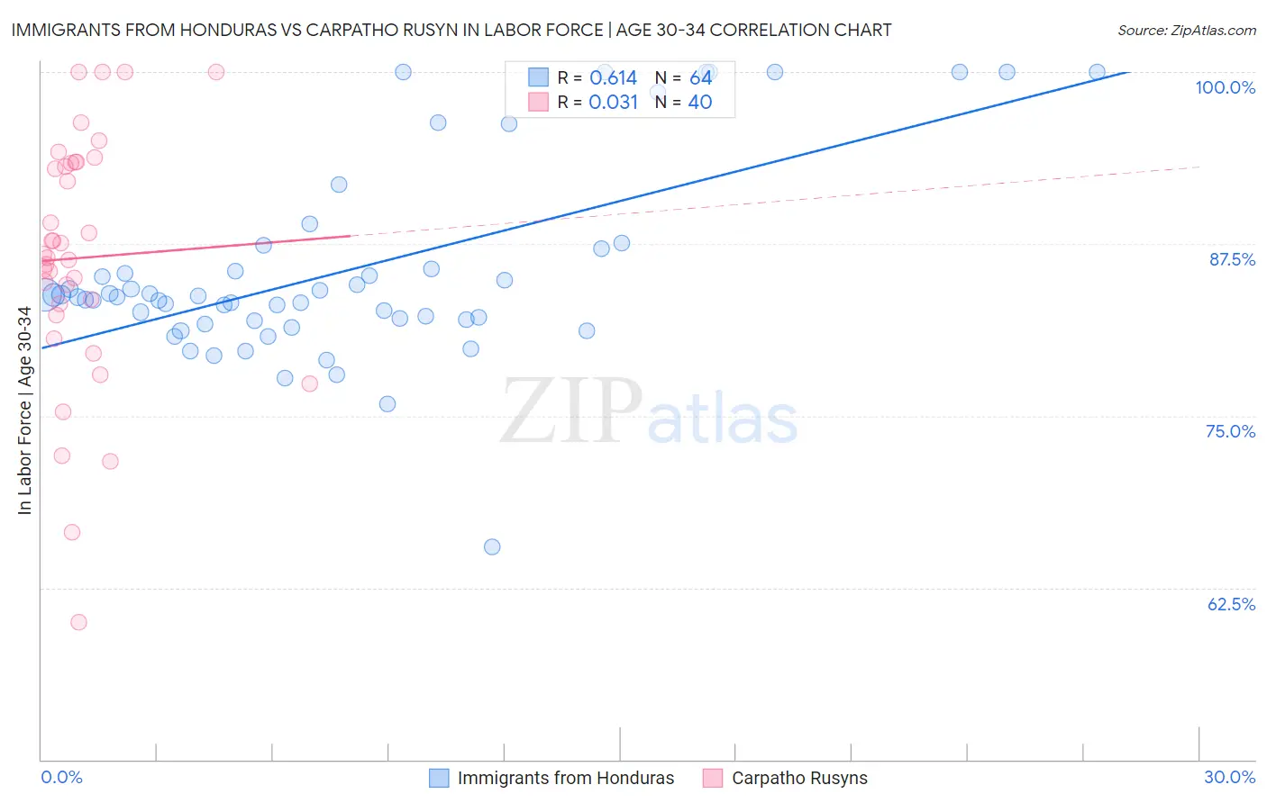 Immigrants from Honduras vs Carpatho Rusyn In Labor Force | Age 30-34 Correlation Chart