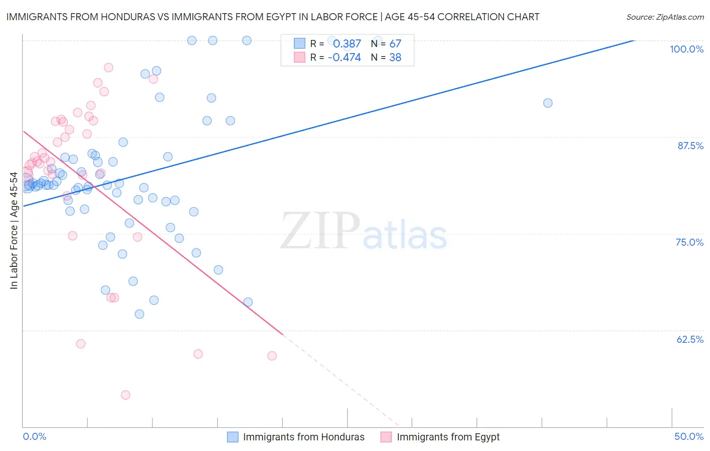 Immigrants from Honduras vs Immigrants from Egypt In Labor Force | Age 45-54 Correlation Chart
