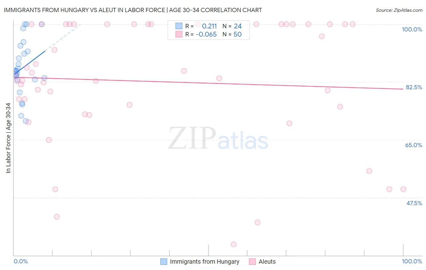 Immigrants from Hungary vs Aleut In Labor Force | Age 30-34 Correlation Chart