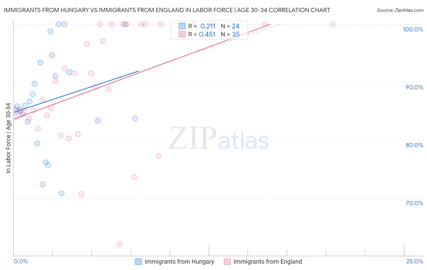 Immigrants from Hungary vs Immigrants from England In Labor Force | Age 30-34 Correlation Chart