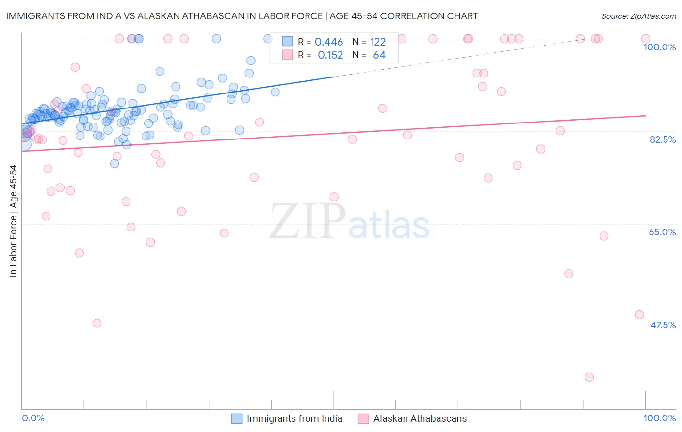 Immigrants from India vs Alaskan Athabascan In Labor Force | Age 45-54 Correlation Chart