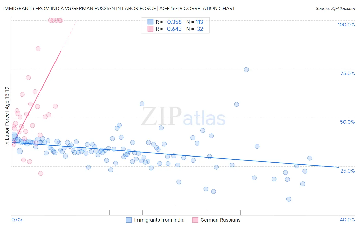 Immigrants from India vs German Russian In Labor Force | Age 16-19 Correlation Chart
