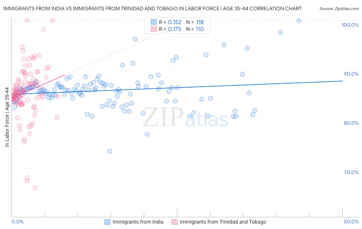 Immigrants from India vs Immigrants from Trinidad and Tobago In Labor Force | Age 35-44 Correlation Chart
