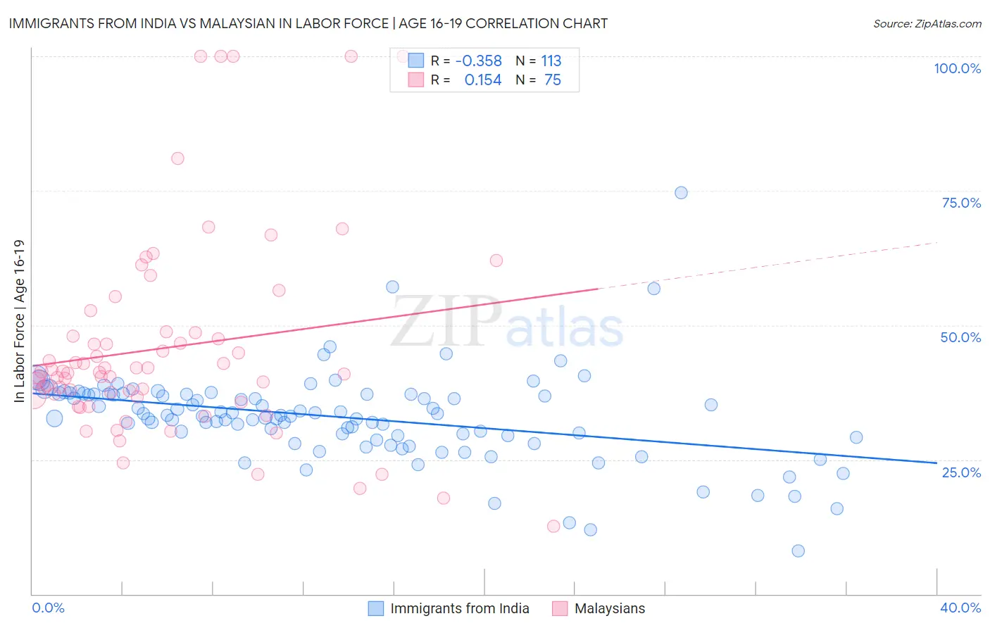 Immigrants from India vs Malaysian In Labor Force | Age 16-19 Correlation Chart