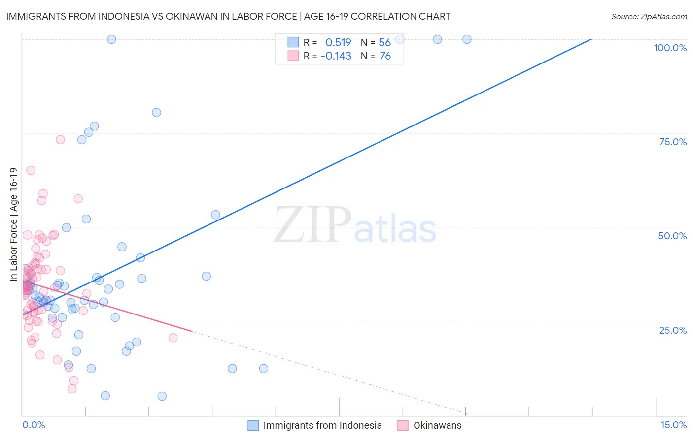 Immigrants from Indonesia vs Okinawan In Labor Force | Age 16-19 Correlation Chart