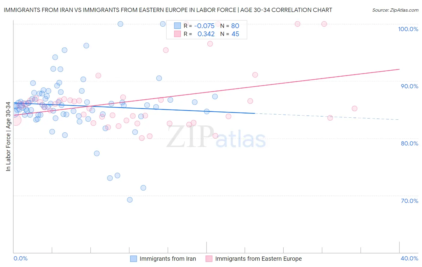 Immigrants from Iran vs Immigrants from Eastern Europe In Labor Force | Age 30-34 Correlation Chart