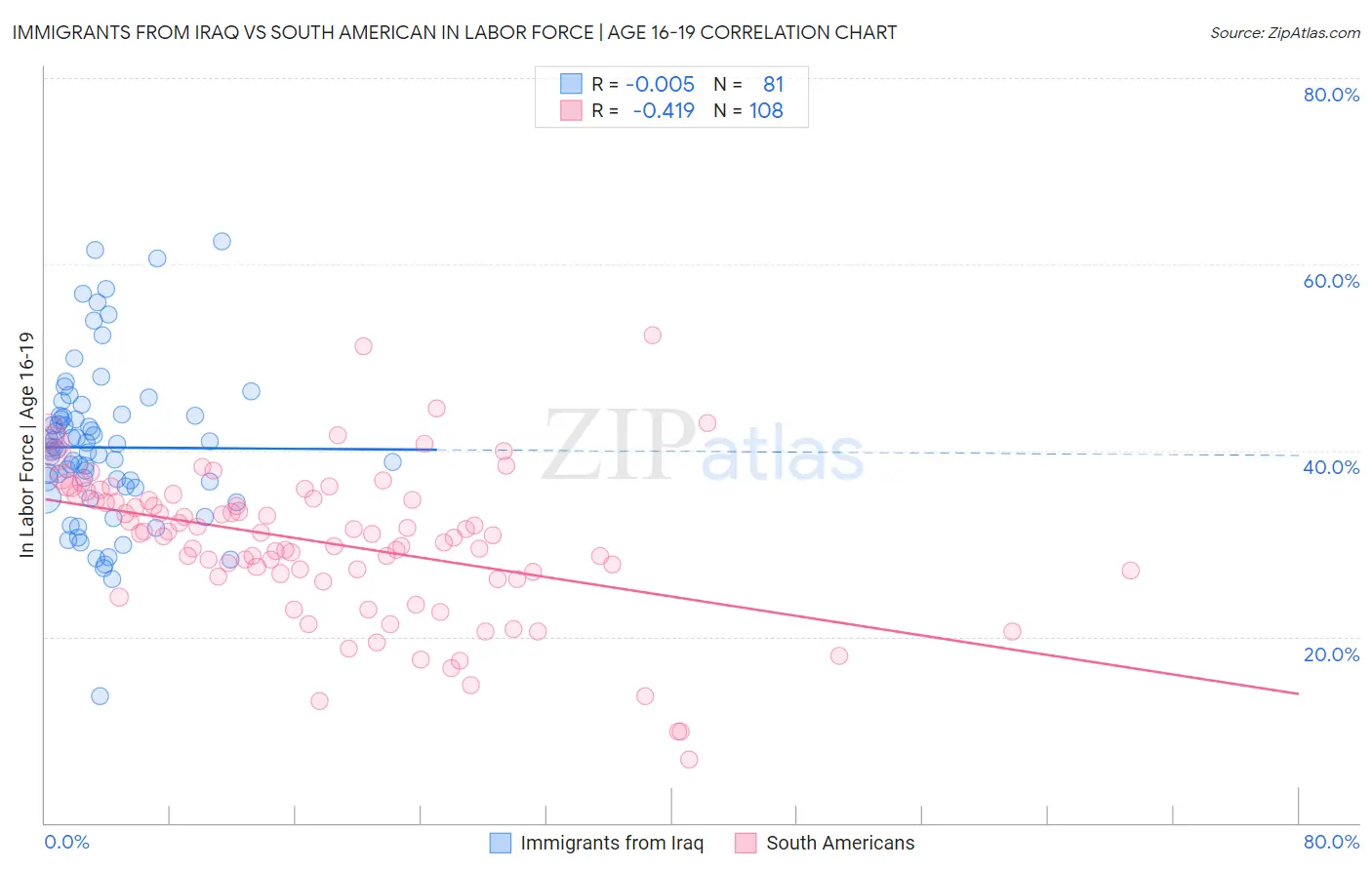 Immigrants from Iraq vs South American In Labor Force | Age 16-19 Correlation Chart