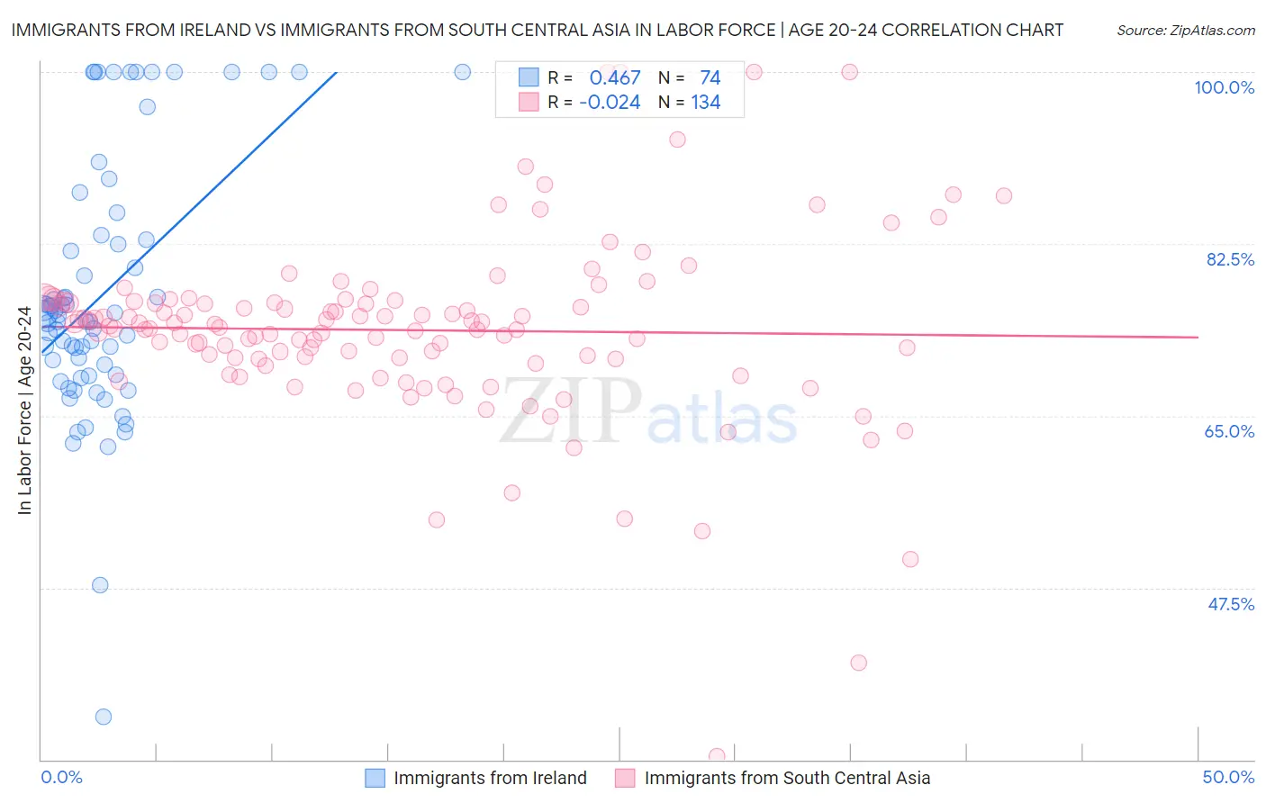 Immigrants from Ireland vs Immigrants from South Central Asia In Labor Force | Age 20-24 Correlation Chart