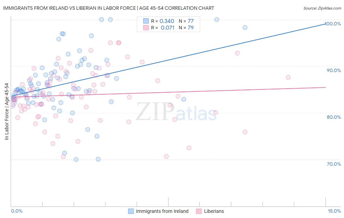 Immigrants from Ireland vs Liberian In Labor Force | Age 45-54 Correlation Chart
