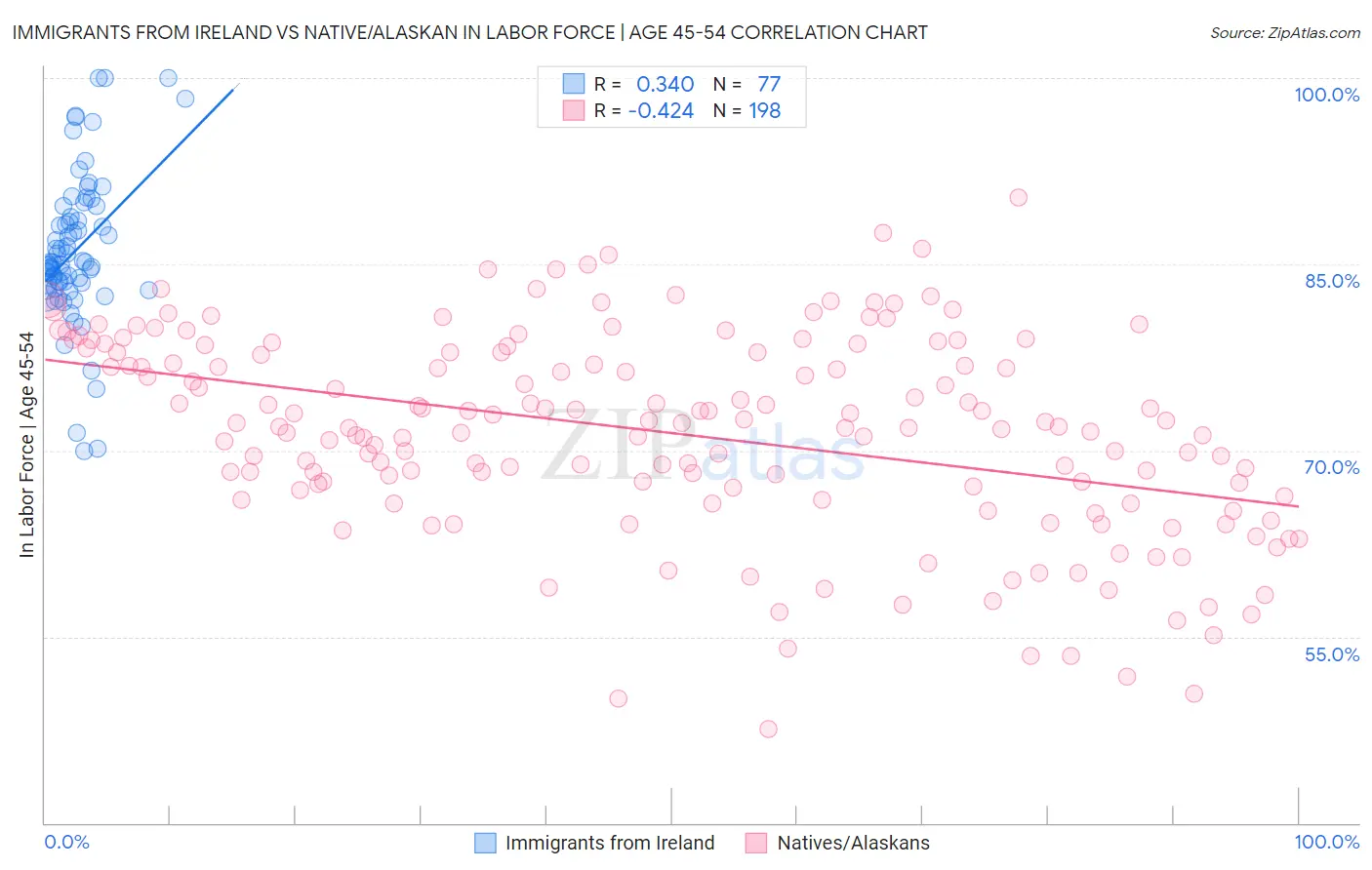 Immigrants from Ireland vs Native/Alaskan In Labor Force | Age 45-54 Correlation Chart