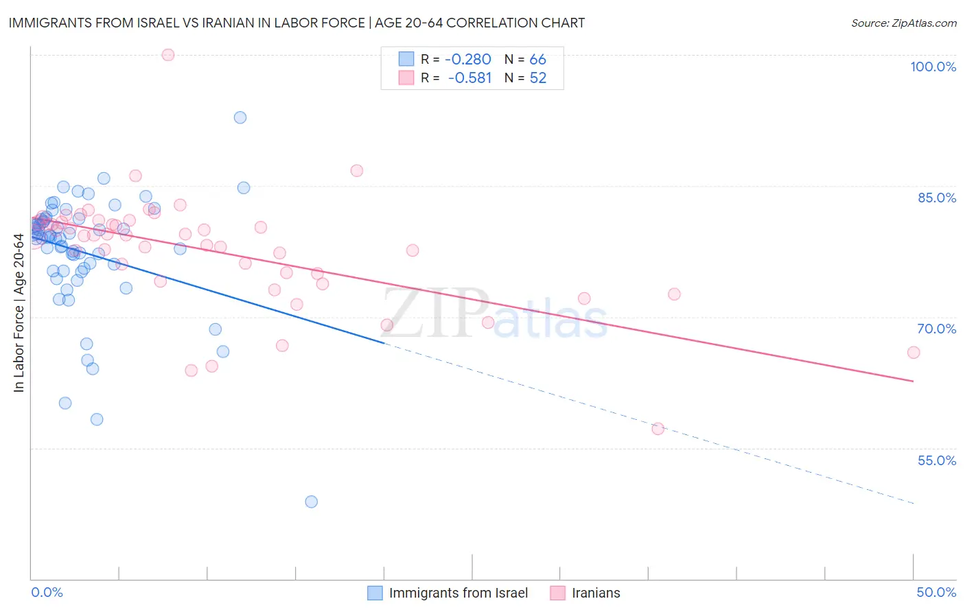 Immigrants from Israel vs Iranian In Labor Force | Age 20-64 Correlation Chart