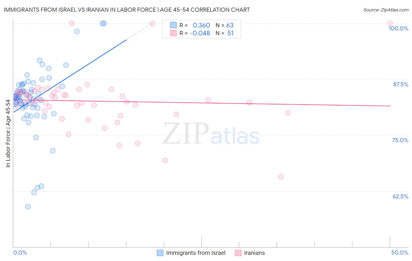 The statistical analysis conducted on geographies consisting of 209,979,344 people shows a mild positive correlation between the proportion of Immigrants from Israel and labor force participation rate among population between the ages 45 and 54 in the United States with a correlation coefficient (R) of 0.360 and weighted average of 83.1%. Similarly, the statistical analysis conducted on geographies consisting of 316,652,476 people shows no correlation between the proportion of Iranians and labor force participation rate among population between the ages 45 and 54 in the United States with a correlation coefficient (R) of -0.048 and weighted average of 83.2%, a difference of 0.19%.