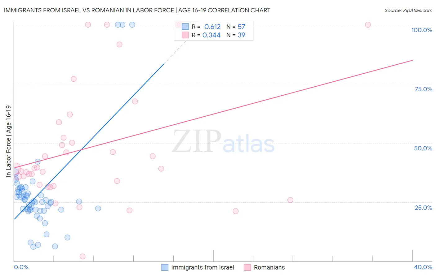 Immigrants from Israel vs Romanian In Labor Force | Age 16-19 Correlation Chart