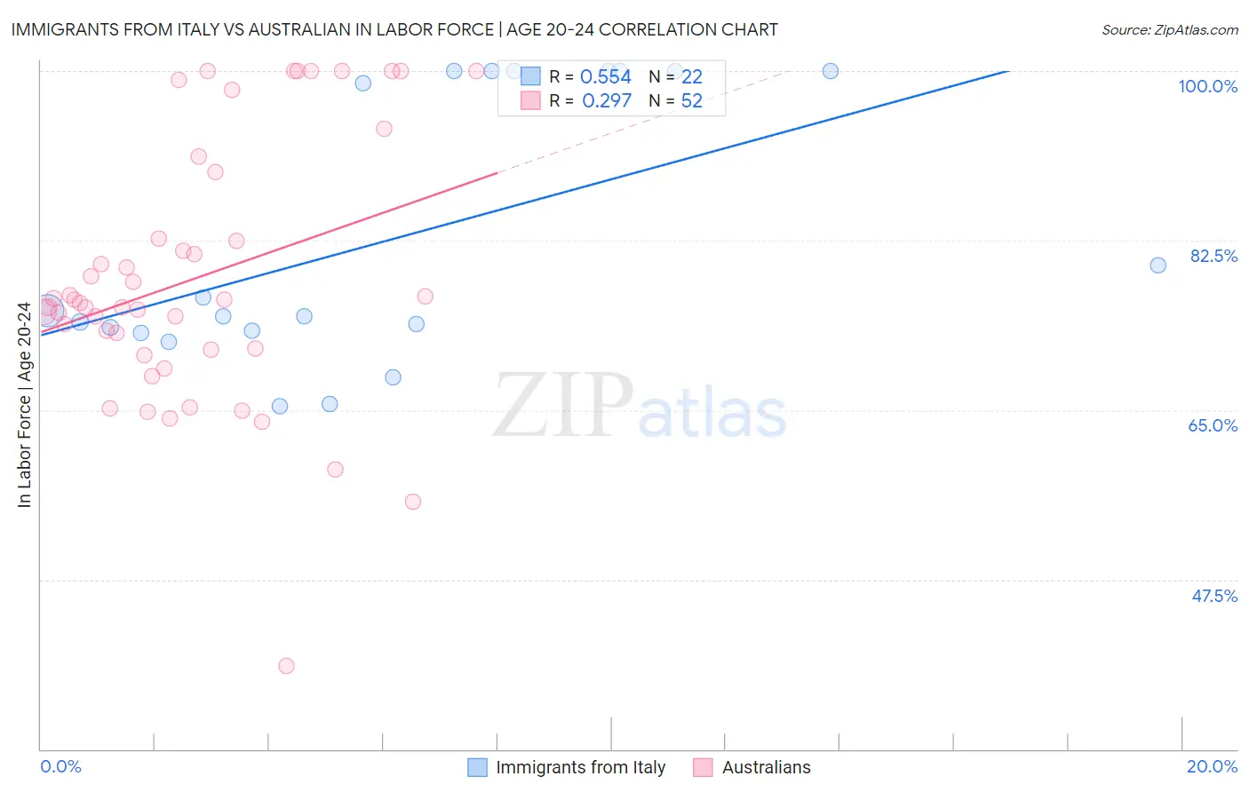 Immigrants from Italy vs Australian In Labor Force | Age 20-24 Correlation Chart