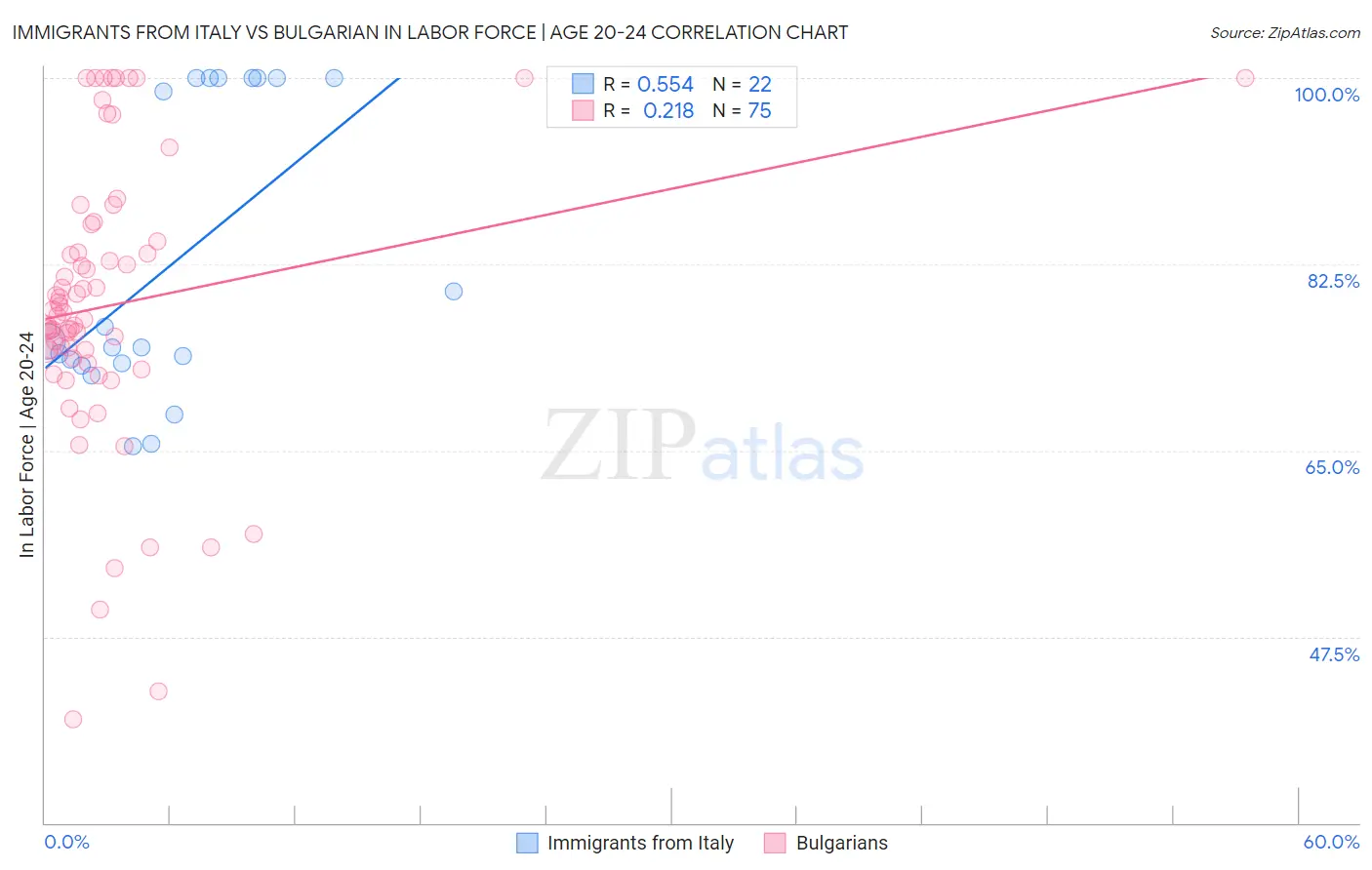 Immigrants from Italy vs Bulgarian In Labor Force | Age 20-24 Correlation Chart
