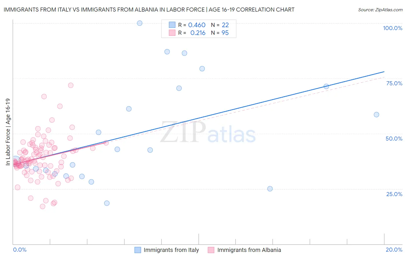 Immigrants from Italy vs Immigrants from Albania In Labor Force | Age 16-19 Correlation Chart